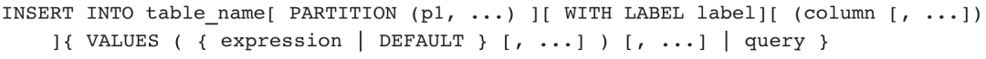 从模板中可以看到,INSERT INTO语句中除了表名是必须有的以外,PARTITION、WITH LABEL、COLUMN、VALUES、QUERY都是可选部分。那么,可选部分有什么特殊用途呢?