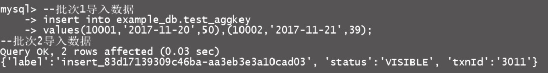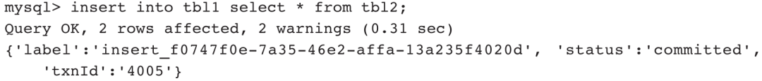 Query OK表示执行成功。2 rows affected表示插入2条记录。label表示用户指定的Label或自动生成的Label,是该INSERT INTO导入作业的标识。每个导入作业在数据库内部都有唯一的Label。status表示导入数据是否可见:如果可见,显示visible;如果不可见,显示committed。txnId表示该次导入作业对应的事务ID。err字段会显示一些其他非预期错误。