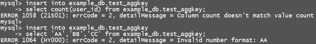 QUERY语句可以是一个非常复杂的查询,支持任意Doris支持的查询语句,支持嵌套查询和WITH查询。INSERT INTO语句本身是一个SQL命令,执行结果分为成功和失败两种。执行成功的截图如图5-1所示,执行失败的截图如图5-2所示。