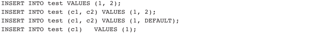 其中,第一条、第二条语句的效果是一样的,在不指定目标列时,将表中的列顺序作为默认目标列。第三条、第四条语句的效果是一样的:导入c2列的默认值。