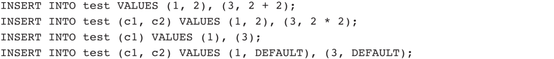 VALUES可以是一条记录,也可以是多条记录,当存在多条记录时,需要用逗号隔开。VALUES语句仅适用于Demo环景,完全不适合在生产环境中应用。