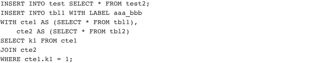 实际项目应用中更多是通过其他方式导入数据,然后通过“INSERT INTO+查询”语句完成数据的合并、关联、映射等处理。查询语句支持WITH子句、复杂查询,例如:
