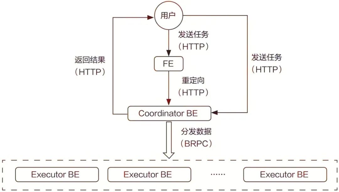 Doris中的FE节点收到用户发送的Stream Load请求(HTTP请求)后,会通过HTTP重定向将数据导入请求转发给某一个BE节点,该BE节点将作为本次Stream Load任务的Coordinator(协调者)。在这个过程中,接收请求的FE节点仅提供转发服务,由作为Coordinator的BE节点实际负责整个导入作业,比如负责向Master FE发送事务请求,从FE节点获取导入执行计划,接收实时数据,分发数据到其他Executor BE节点,以及数据导入结束后返回结果给用户。用户也可以将Stream Load请求直接提交给某一个指定的BE节点,然后该节点作为本次Stream Load任务的Coordinator。在Stream Load任务执行过程中,Executor BE节点负责将数据写入存储层。