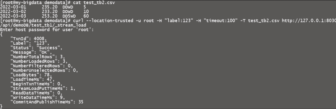 Stream Load执行完成后,Doris会以JSON格式展示导入结果,导入成功的截图如图5-4所示。