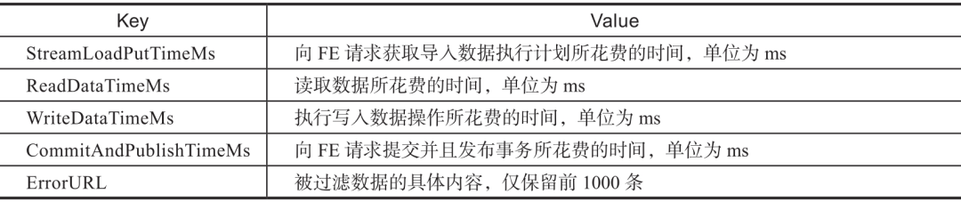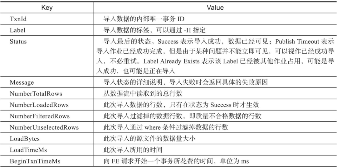 Stream Load返回结果包含非常丰富的信息,以键值对形式展现,如表5-1所示。