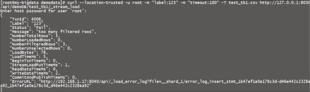 数据导入时可能会出现格式不匹配或者不满足非空要求的情况,导致导入失败。Stream Load失败截图如图5-5所示。