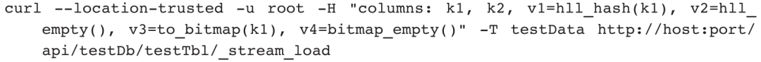示例5:导入含有HLL列或BITMAP列的表,其中v1和v3列基于导入的字段衍生而来,v2和v4列填充空值。