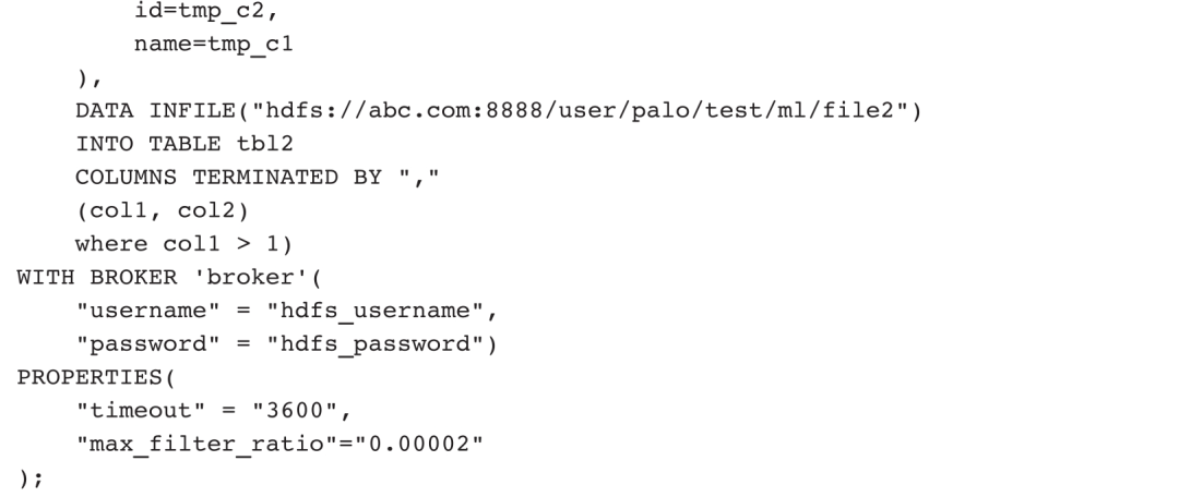 ❑max_filter_ratio:最大容忍可过滤的数据比例,默认为零容忍。这里的过滤数据不包含通过where条件过滤掉的记录,主要是指数据类型不匹配导致导入失败的记录。