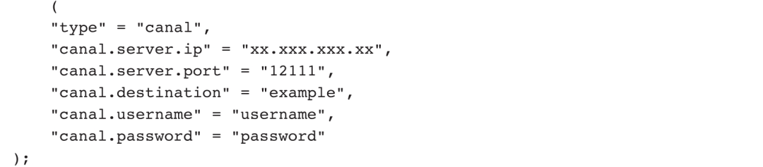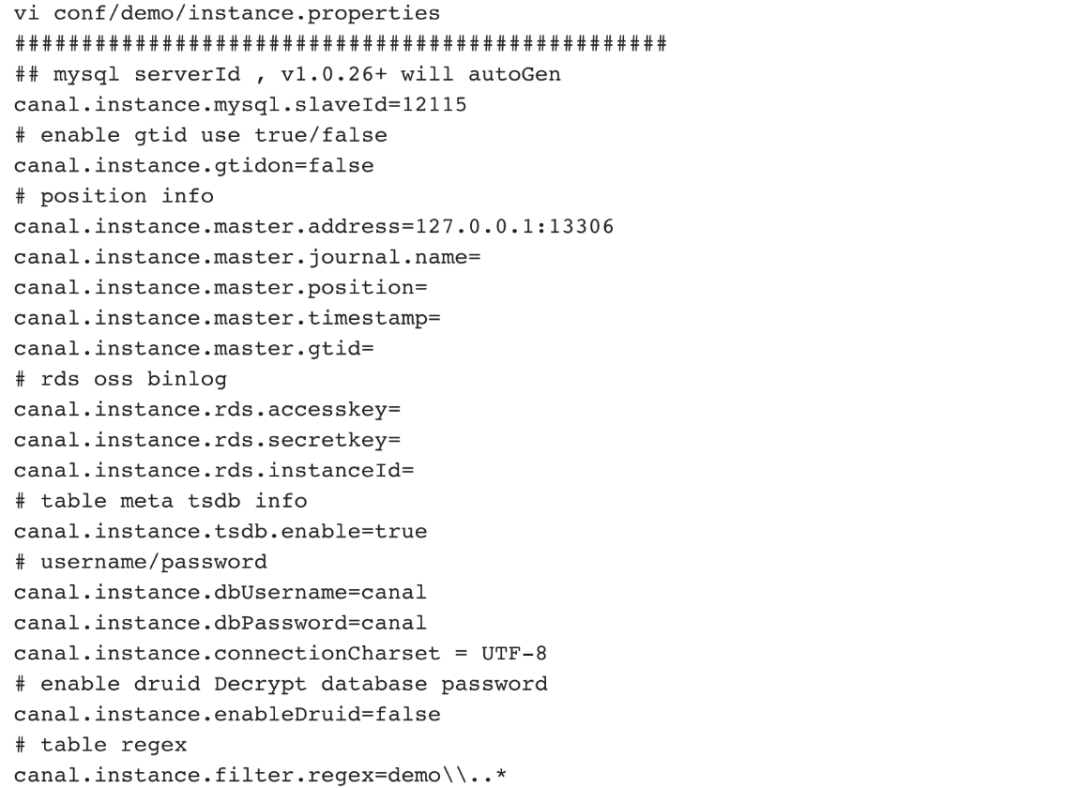 具体的Canal参数配置可以参考Canal官方文档(地址为https://github.com/alibaba/canal/wiki/QuickStart)。下面给出一个精简的Canal配置模板(去掉了大量无效配置行):