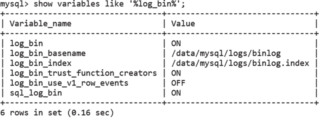 通过show variables like '%log_bin%'命令检查配置是否起作用,以及Binlog配置是否开启,如图5-11所示。