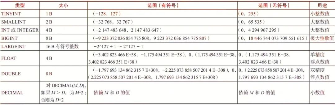Doris支持的数值类型主要有以下几种形式,和MySQL比,只少了MEDIUMINT类型,并且新增了LARGEINT类型。Doris支持的数值类型及其范围如表3-1所示。