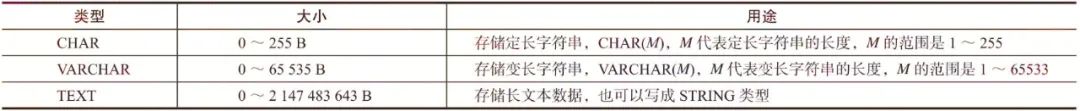 相对于MySQL,Doris支持的字符串类型精简了很多,仅保留CHAR、VARCHAR及TEXT类型。Doris支持的字符串类型及其用途表述如表3-3所示。