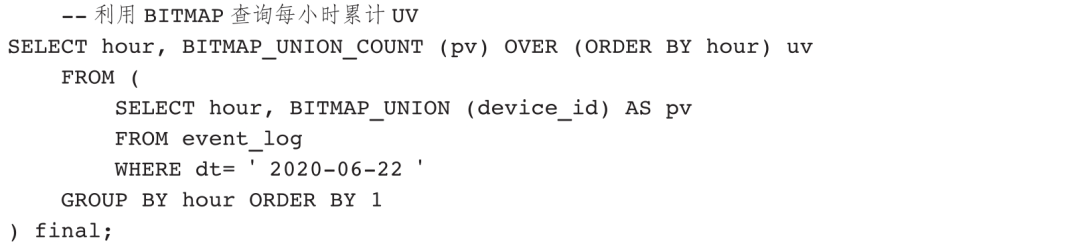 BITMAP_UNION用于对Bitmap类型字段进行汇总,常见使用场景如下。
