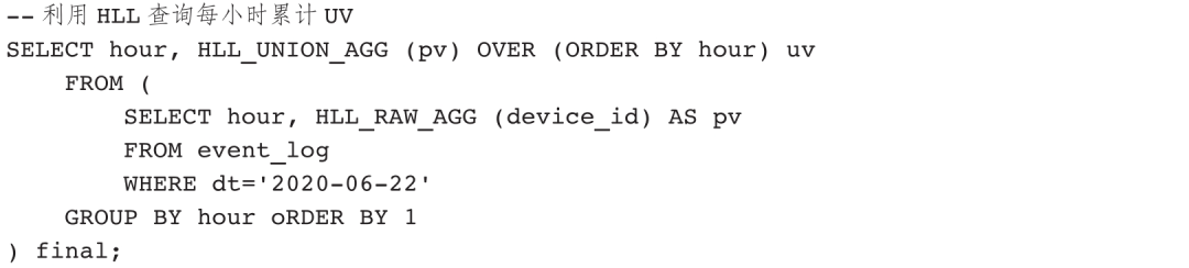 在数据量大的情况下,HLL类型模糊去重性能优于COUNT DISTINCT和BITMAP_UNION_COUNT。HLL算法的误差率通常在1%左右,默认可计算去重数据的最大数量为1.6e12,误差率最大可达2.3%。注意:如果去重结果超过默认规格会导致计算结果误差变大,或计算失败并报错。下面展示构建HLL类型计算去重值的典型案例。