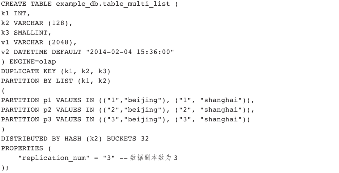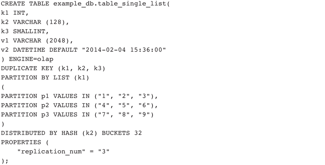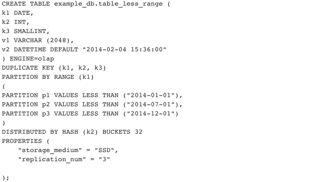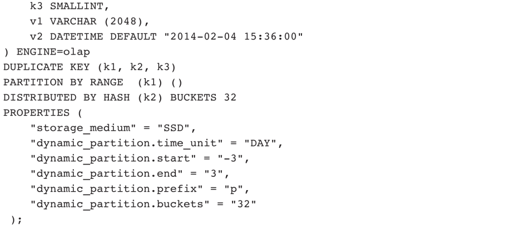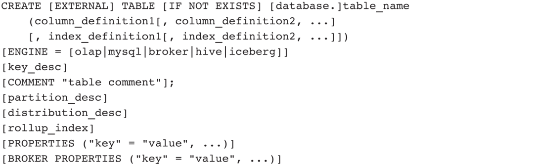 ENGINE默认支持表类型为OLAP,还支持MySQL、Broker、Hive、Iceberg四种外部表。本节聚焦于OLAP表定义说明,关于外部表在3.4节展开说明。OLAP表定义主要包含列定义、键描述、分区描述、分布描述和键值对五部分内容,其中列定义、键描述、分布描述是必需的,键值对根据需求添加,分区描述在3.3节展开说明。