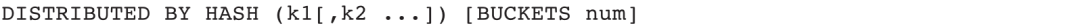 分布描述用于定义表数据的分桶数和分布键。分桶数是指数据切分份数,分布键是切分的依据,推荐使用Hash分桶。Hash分桶语法如下: