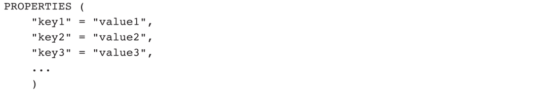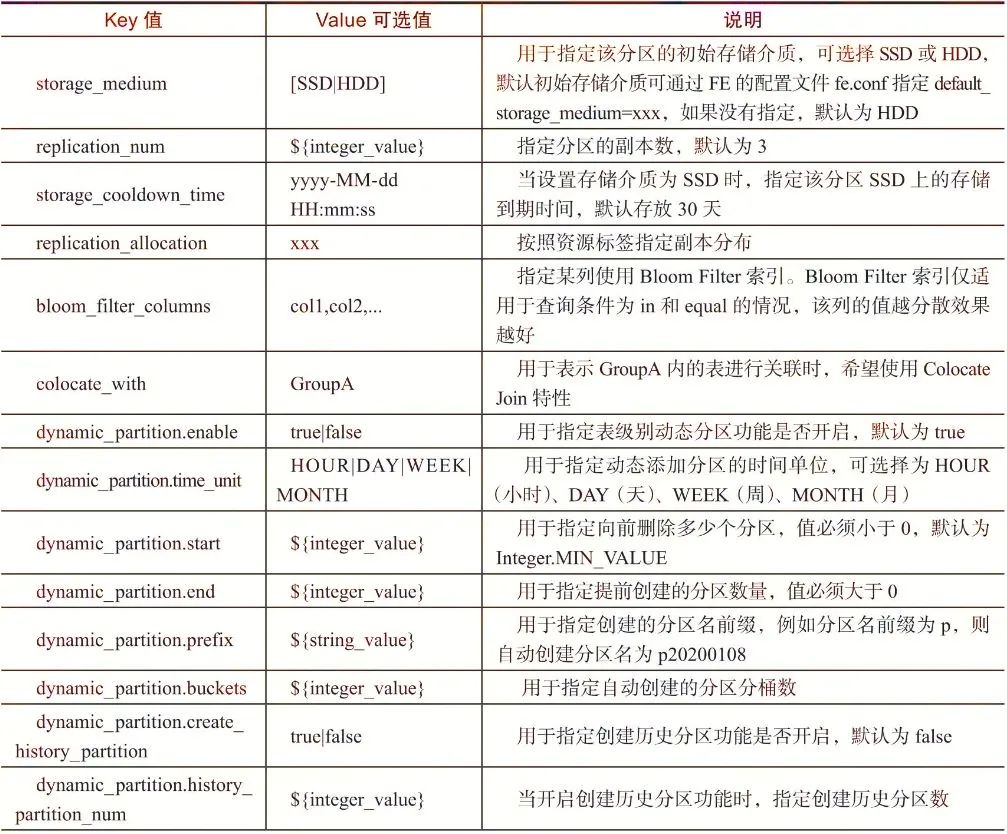 针对OLAP类型的表引擎,PROPERTIES主要用于设置表的存储特性、索引特性、动态分区特性、内存表特性等。键值对表达式为:
