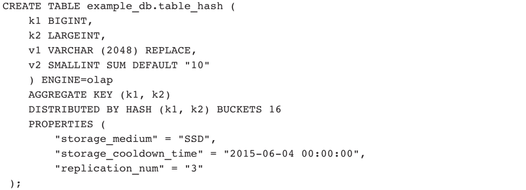 示例1:创建一个OLAP表,使用Hash分桶,使用列存,覆盖相同Key的记录,设置初始存储介质和冷却时间。
