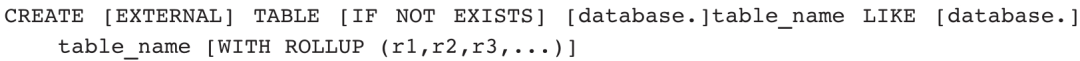 除了根据基础语句创建表外,Doris还支持CREATE TABLE LIKE建表语句(用于创建一个表结构和另一张完全相同的空表),同时支持可选复制一些ROLLUP对象。语法模板如下: