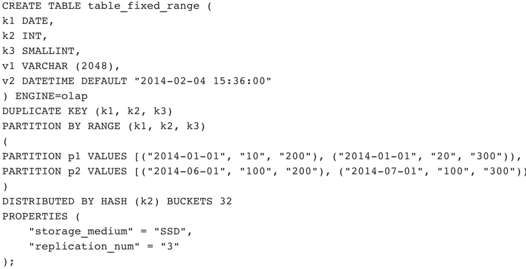 示例2:创建Fixed Range分区,并且按照3个字段划分分区。