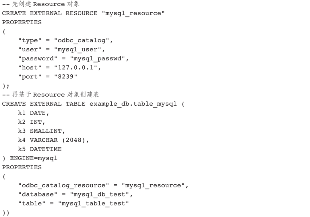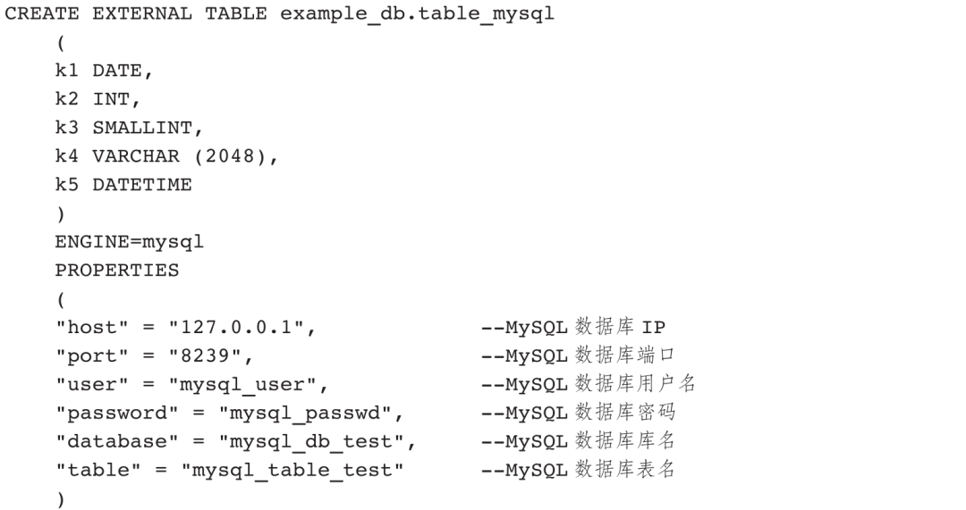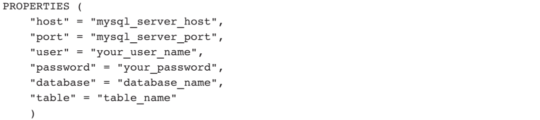 如果是MySQL表引擎,表的访问需要在PROPERTIES中提供以下信息: