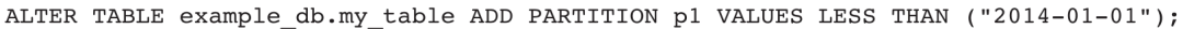 上述代码会将数据划分成3个分区:[MIN,"2014-01-01"),["2014-01-01","2014-07-01"),["2014-07-01","2014-12-01")。不在这些分区范围内的数据将被视为非法数据而过滤。