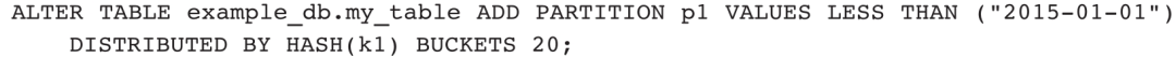 1)增加分区。现有分区[MIN,2013-01-01),增加分区[2013-01-01,2014-01-01),使用默认分桶方式: