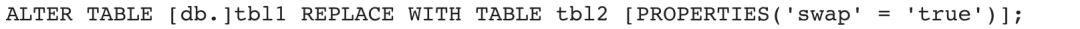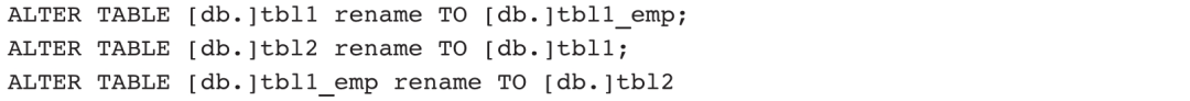 其中,swap参数默认为true。如果swap参数为true,执行语句后,tbl1表中的数据为tbl2表中的数据,tbl2表中的数据为tbl1表中的数据,即两张表中的数据发生了互换。如果swap参数为false,执行语句后,tbl1表中的数据为tbl2表中的数据,而tbl2表被删除。