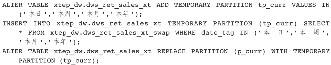 分区表分区数据交换是通过临时分区实现的,操作语句如下: