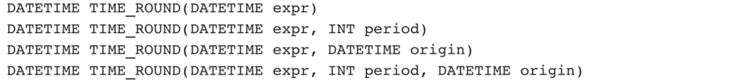 TIME_ROUND函数由两部分组成:TIME部分可以是SECOND、MINUTE、HOUR、DAY、WEEK、MONTH、YEAR,ROUND部分可以是FLOOR(下限)、CEIL(上限),这两部分组合起来就有14种形式。该函数的参数可以变化,进而衍生出更多类型。TIME_ROUND的参数有以下4种形式: