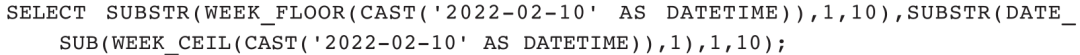 2)获取2022年2月10日所在周的第一天和最后一天: