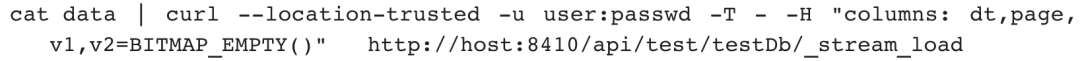 Doris中常用的BITMAP函数包括BITMAP_EMPTY、BITMAP_HASH、BITMAP_UNION等。BITMAP_EMPTY用于返回一个空的Bitmap,主要用于执行INSERTINTO或Stream Load任务时填充默认值,例如: