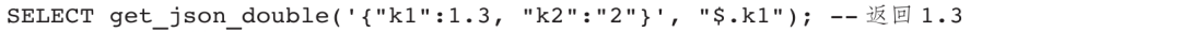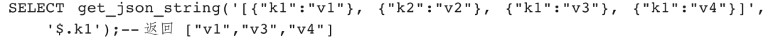 get_json_double()、get_json_int()、get_json_string()函数可分别提取JSON字符串内指定路径的数值、整型、字符串内容。json_path必须以“$”符号开头,以“.”为分割符,如果路径中包含“.”,使用双引号包围起来。“[]”表示数组下标(从0开始)。路径中不能包含"、[、]。如果json_string格式不对,或json_path格式不对,或无法找到匹配项,返回NULL。