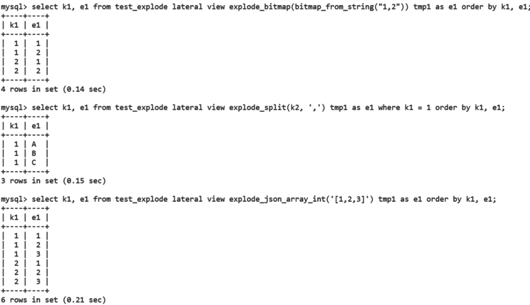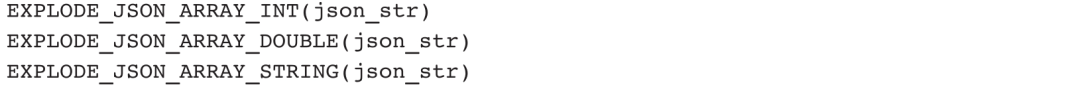 表函数主要用于将一条记录转换成多条记录,需要配合Lateral View使用。表函数主要有EXPLODE_BITMAP、EXPLODE_SPLIT、EXPLODE_JSON_ARRAY,可分别将Bitmap对象、字符串、JSON数组展开形成多条记录。其中,EXPLODE_JSON_ARRAY主要包含下面3种用法: