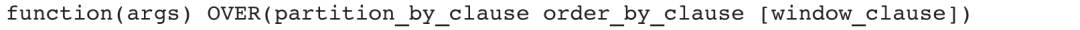 窗口函数由Function函数、PARTITION BY子句、ORDER BY子句和Window子句4部分组成,除Function函数以外,其他都可以省略。