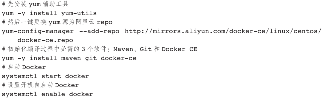 安装编译环境,包括Maven、Git和Docker,依次执行如下命令: