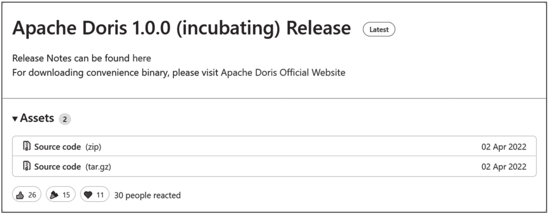 百度版本的Doris不再单独提供分支,可直接进入GitHub主页下载(地址为:https://github.com/apache/incubator-doris)。在GitHub主页的Releases页面,我们可以看到最近发布的Doris版本。图2-1是Doris1.0.0版本发布截图,发布时间为2022年4月2日。