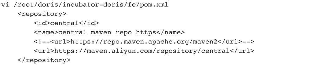 为了提高FE编译速度,我们需要将Central的地址换为阿里云的地址——https://maven.aliyun.com/repository/central,操作如下。