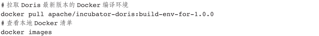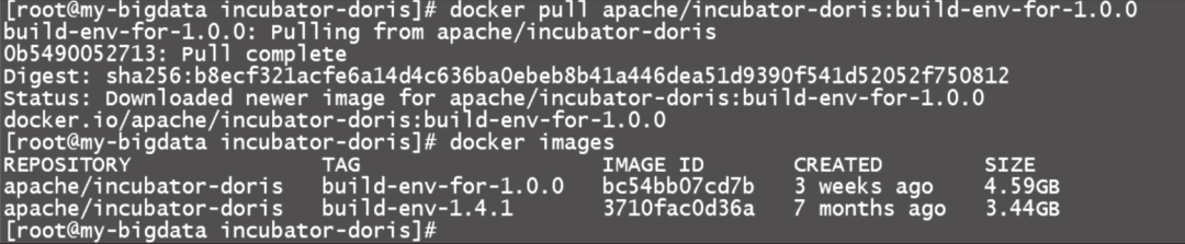 针对不同的Doris版本,我们需要下载对应版本的镜像。从Doris 0.15版本起,后续镜像的版本号将与Doris的版本号统一,比如可以使用镜像apache/incubator-doris:build-env-for-0.15.0来编译Doris 0.15.0版本。apache/incubator-doris:build-env-ldb-toolchain-latest用于编译最新主干版本代码,会随主干版本不断更新。这里,我们编译Doris 1.0.0版本,使用apache/incubator-doris:build-env-for-1.0.0镜像,操作过程截图如图2-3所示。