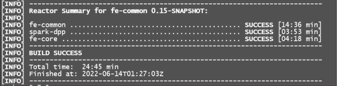 从编译过程可以看出,BE节点的C++代码编译比较费时,大约需要1h;FE节点的Java代码编译大约需要25min。sh build.sh命令是依次编译BE和FE组件的,待编译完成后,我们可以看到图2-4所示的界面,这就说明编译成功了。