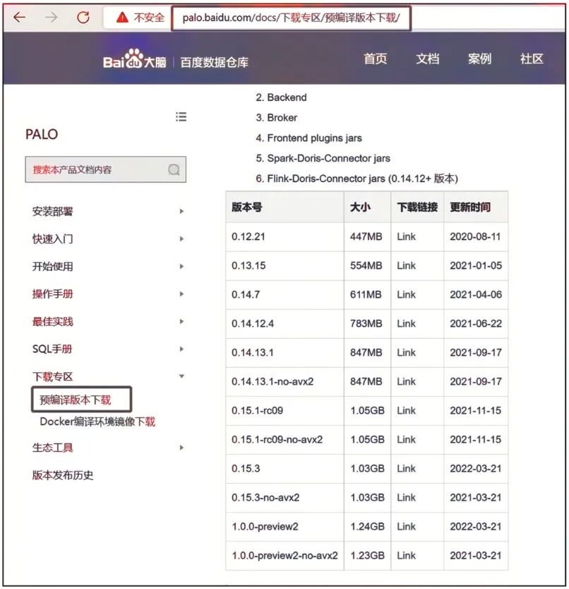 有Java开发经验的读者可以按照2.2节的操作进行源码编译,如果不想编译直接使用,则可以到Palo官网进行下载。作为Apache Doris社区的主要维护团队,百度Doris团队同时维护了完全兼容Apache Doris的发行版本Palo。百度发行版本Palo具有Bug修复和新功能更新功能。百度开源版本不是Apache Release版本,但具有全部Apache Doris功能,并与Apache社区版本兼容。百度发行版本Palo在百度内部做过测试,推荐使用,而且用户可以免费下载,安装和部署方式同Apache Doris。