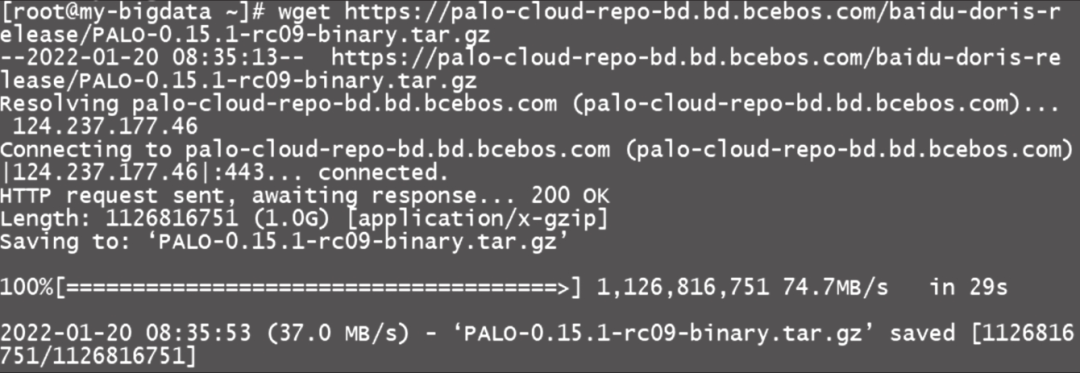 在CentOS系统中通过wget命令下载百度Palo预编译版本,如图2-8所示。