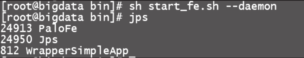 FE组件的安装非常简单,最新Doris版本的安装包自动创建了doris-meta目录,我们可以直接到bin目录下执行命令sh start_fe.sh --daemon来启动FE。执行该命令后如果没有任何输出,FE启动成功。我们也可以通过jps命令验证FE是否启动成功,有PaloFe进程表示启动成功。FE节点启动及验证过程如图2-10所示。