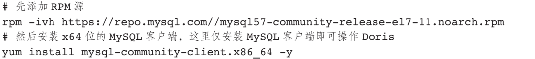 第二种方式是通过MySQL客户端访问。这里我们既可以直接在服务器上通过MySQL命令访问FE,也可以通过客户端软件配置JDBC访问,默认root密码为空。数据库安装人员必须要掌握命令行模式,因此这里需要先安装MySQL客户端,具体如下。