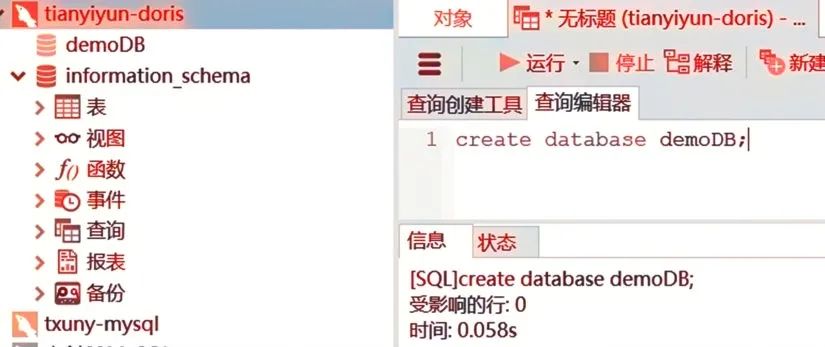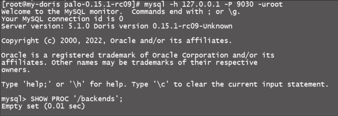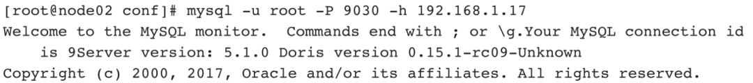 安装完成以后,我们可以通过MySQL命令连接Doris数据库,操作如下: