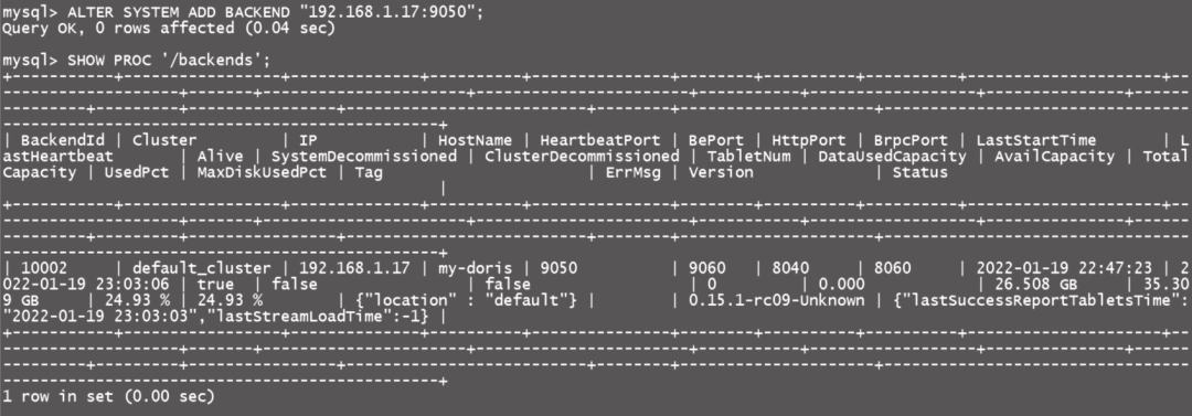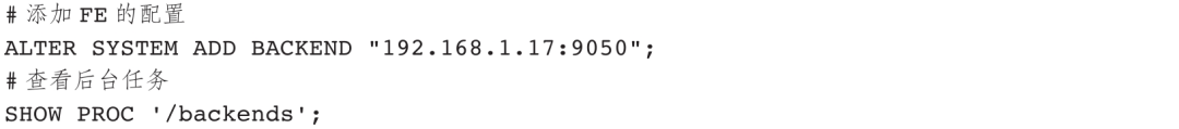 BE节点启动后,需要向FE节点注册信息才可加入集群,具体如下(这里要用到前面安装的MySQL客户端):