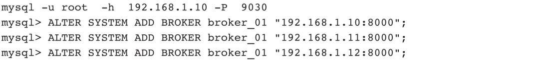 3)添加Broker。要想让Doris的FE和BE知道Broker在哪些节点上,通过SQL命令添加Broker节点列表。使用mysql-client连接已启动的FE节点,命令如下:
