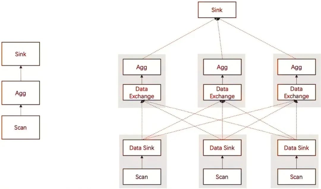 逻辑执行计划的Agg阶段分为先重分布数据再汇总两个步骤,这个过程和Hadoop类似,都是按照相同的Key进行数据重分布。