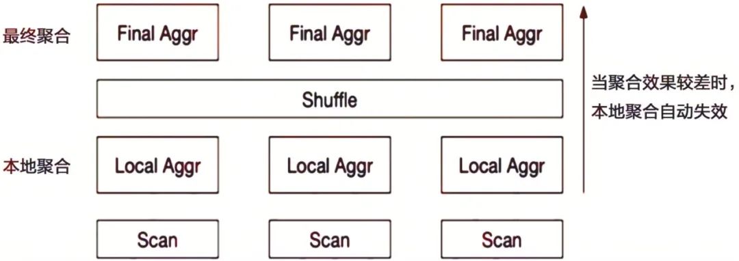 在此基础上,Doris还实现了自适应聚合。首先我们要知道,聚合算子是一种阻塞型算子,需要等全部数据处理完后,才会将数据发送给上层节点。而自适应聚合是在第一级聚合中,如果发现聚合效果很差,即使聚合后也无法有效减少需要传输的数据,则会自动停止第一级聚合,转换为非阻塞的流式算子,直接将读取的数据发送到上层节点,从而避免不必要的阻塞等待。