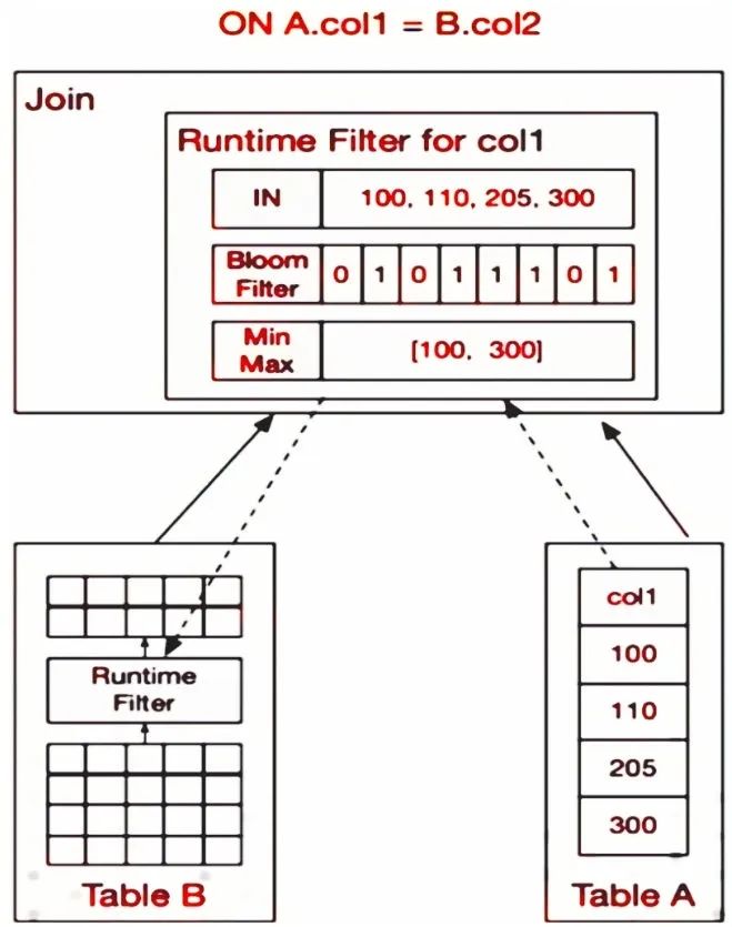 Runtime Filter的设计思路是在右表内存中构建HashTable的同时,为连接列生成一个过滤器,之后把这个过滤器推给左表。这样,左表就可以利用过滤器对数据进行过滤,从而减少Probe节点需要传输和比对的数据。这种过滤器被称为Runtime Filter。针对不同的数据,Doris设计了不同类型的过滤器,例如In Predicate、Bloom Filter和Min Max。用户可以根据不同场景选择不同的过滤器。